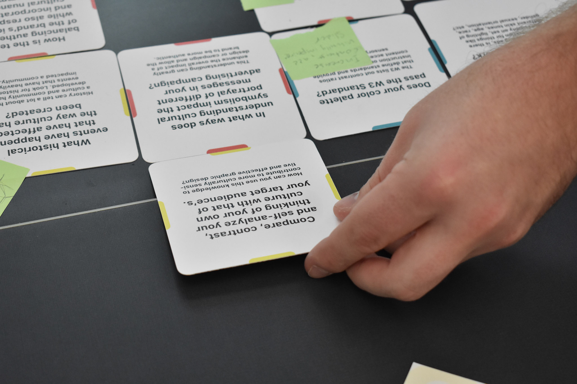 Design teams will primarily benefit from this deck as it will contain points of discussion. They will use these in a team meeting. This suggests that the deliverable must be easily moveable (a deck of cards is easy to carry). Each individual card will contain a single question to keep the activity easy to understand and straight to the point. Using a deck of cards also allows the conversation to stay at the table and keeps the team interacting with one another through a tactile manner.